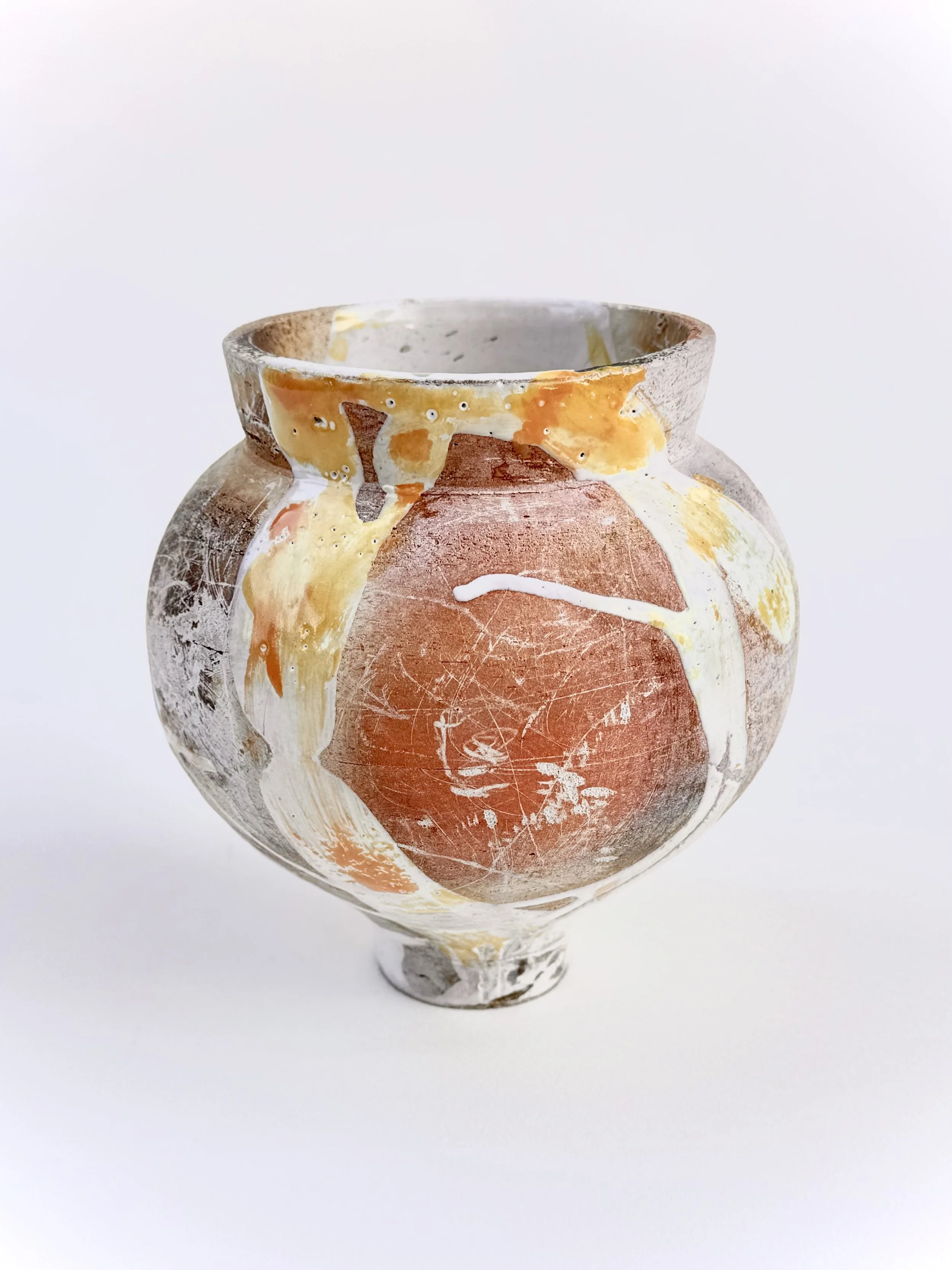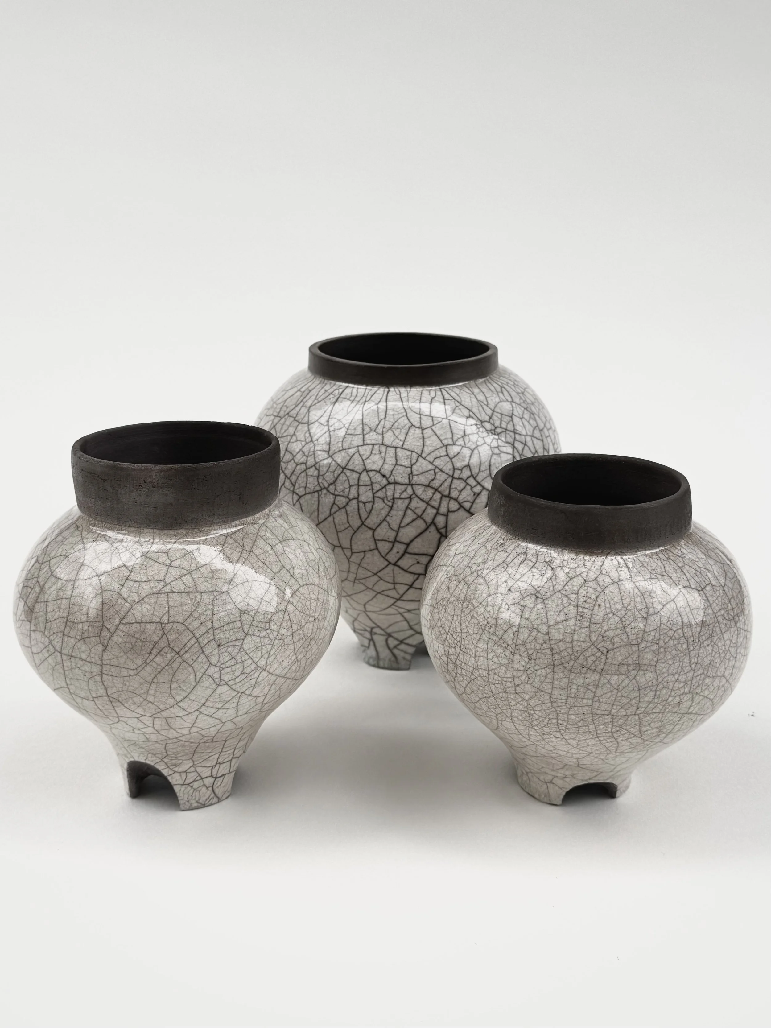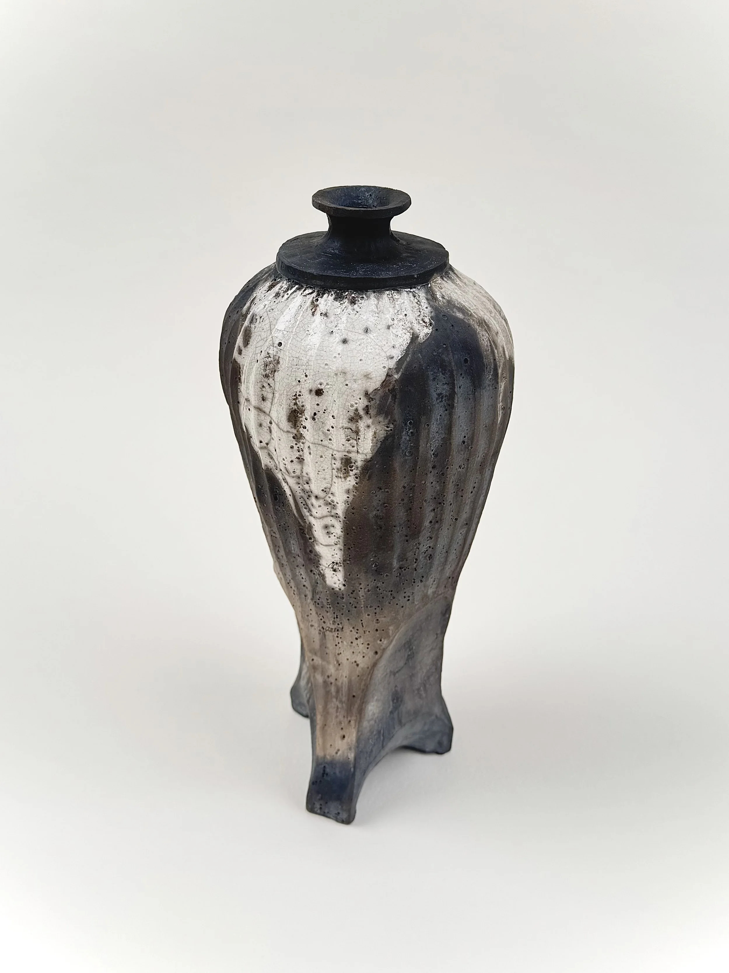 In the studio, James often works with atmospheric firings, like raku or gas, that highlight the role of chance in the making process. His work leans sculptural and non-functional, favoring unique forms and tactile surfaces.